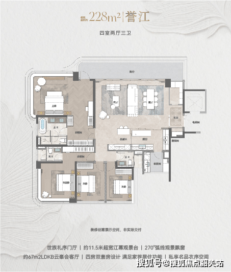 主力户型遵循广州新规设计,实现了约100%的使用率,这在高层住宅中显得尤为难得。以建面约228平方米的四室两厅三卫户型为例,该户型配备了约11.5米超宽的江幕观景台,以及面积约67平方米的LDKB(客餐厨阳台)一体化云峯会客厅。这种大面宽的设计,配合270°的环幕飘窗,将江景最大限度地引入室内,形成了真正的“空中观景台”。双套房的设计逻辑,则充分考量了多代同堂家庭的居住隐私需求,主仆分区明确,动线合理。而建面约133平方米的户型,作为纯南向园景单边户,同样做到了6.8米超阔观景台与LDKB一体化设计的结合,在保证功能性的同时,兼顾了景观体验,满足了不同家庭结构对改善居住的多元化需求。T3的梯户比配置,配合私梯入户设计,进一步保障了居住的私密性与仪式感。