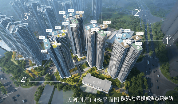 天河润府采用创新 T5 蝶式楼型设计,通过梯腿偏转实现户户南向通风采光,同时楼栋之间法线互错,有效降低户与户之间的互视影响,保障业主居住私密性。项目北地块采用整体抬高设计,含地块抬高与架空层在内整体抬升约 11.2 米,住宅起始层相当于常规住宅的 4 层高度,不仅进一步提升了业主的居住私密性,也优化了室内的通风采光与景观视野效果。