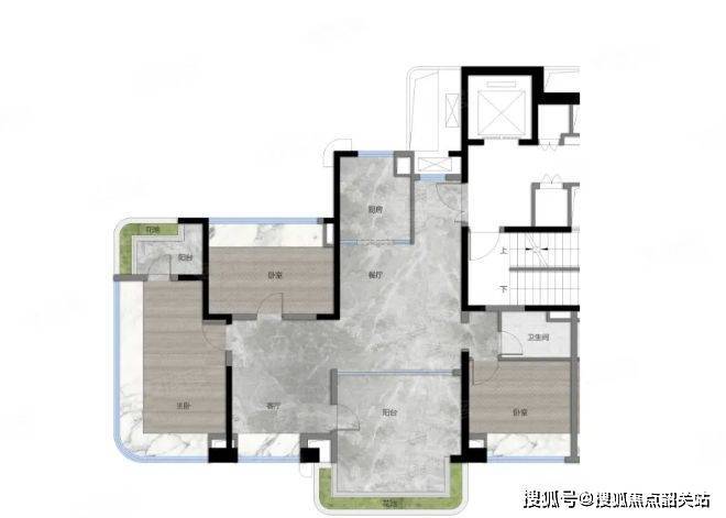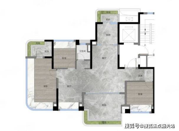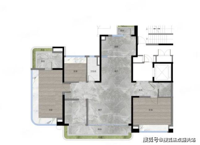 120 平户型:数量相对较少,大概 90 套。为南北对流双阳台四房,客厅到卧室门墙一体化设计,门墙缝隙至毫米级,实现静音、隔声功能。厨房采用宽幅岩板墙面,缝隙隐形,颜值高且易清洁;石英石台面,耐磨抗污。户内几乎零涂料处理,采用木饰面 / 墙布 + 皮质硬包造型,健康环保。