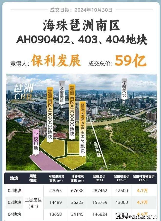 2024 年 10 月 30 日,保利发展以超 59 亿总价拿下广州琶洲南三兄弟地块(AH090402 号、03 号、04 号地块)。地块总占地约 6.66 公顷,体量 12.8 万方,楼面价 4.25 万 - 4.3 万 / 平(未扣除配建)。该地块虽当前是无路无桥的生地,但位置优越,位于琶洲南 TOD 项目东侧,与大围公园相邻,北靠琶洲中区广交会展馆,景观资源丰富。如今项目定案名为保利天奕,小区楼栋均为正南正北 T2 板楼,共三个地块却似一个整体,通过密林景观道相连。项目基本信息为:开发商保利地产,产权 70 年,占地约 52000m² ,总建面约 138000m² ,容积率 2.5,20 栋楼,预计 900 户 ,首开面积 120 - 140 - 190㎡ 。