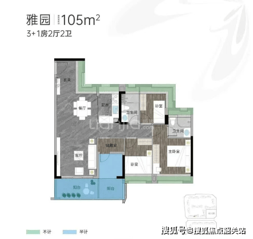 针对刚改人群,项目推出了103至105平方米的“3+1”房两厅两卫户型。这款户型实现了四开间朝南的奢侈布局,阳光洒满每一个角落。其实际使用空间可媲美旧规下的120平方米户型,足以满足三代同堂的居住需求。多出的一个“+1”房间可根据家庭需要灵活改造为书房、儿童房或储物间,极大地提升了居住的灵活性。