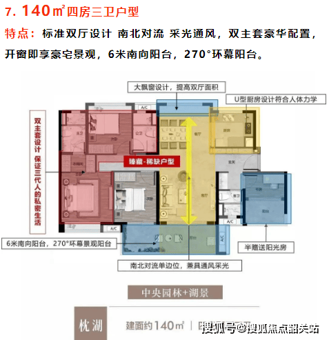 140㎡四房三卫:豪华配置,双主套设计,6米南向阳台,豪宅级别的居住体验。