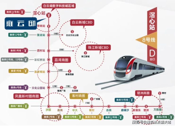 2. 多维枢纽:立体交通网络擘画高效出行蓝图。步行约600米即达地铁8号线滘心站,这条被誉为“换乘之王”的线路串联老荔湾、海珠西、客村、琶洲等核心区域,现有8个换乘站点可无缝衔接1-2-3号线及广佛线等多条轨交线路。区域三高速路网环绕,接驳内环仅需35分钟即可畅达天河、海珠、荔湾等主城板块,更可快速连通华快、广佛肇、广清、机场高速等交通动脉。值得关注的是,440亿打造的白云站TOD枢纽规划落定,将形成1轻轨+2高铁+7地铁的超级交通矩阵,2023年底白云站正式开通后,这里将成为串联全国及大湾区的重要交通枢纽,为板块注入强劲发展动能。