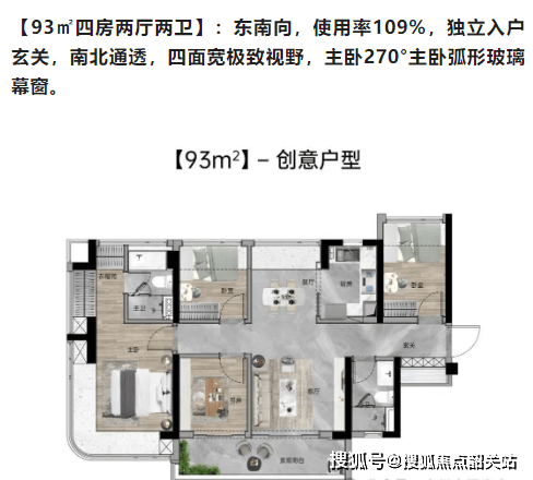 项目提供了从80平方米到125平方米的多种户型选择,涵盖三房至五房的设计。所有户型均为全南向布局,拥有超过100%的使用率,其中部分户型的使用率甚至高达110%。例如,80平方米户型使用率可达107%,四开间朝南,主卧配有270°弧形玻璃幕窗;93平方米户型使用率109%,南北通透,视野开阔。每个户型都经过精心设计,注重居住舒适度和空间利用率。
