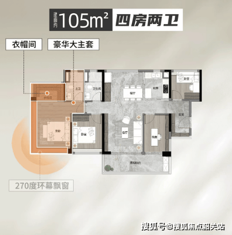 105平方米四房:单边户南北通透,适合三代同堂家庭。