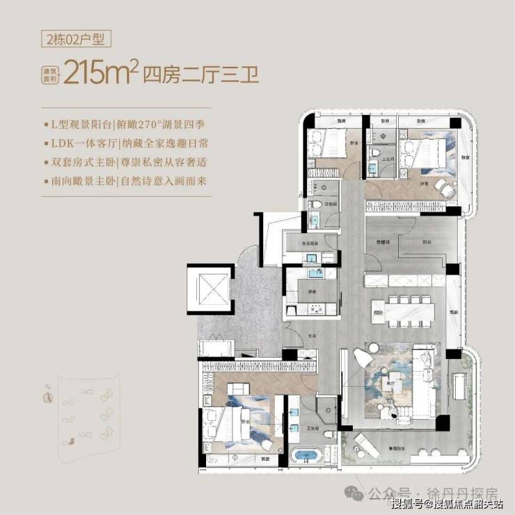 具体来看,160-180㎡户型采用双阳台南北对流设计,6米开间客厅衔接观景阳台,阳台朝向正南,可直接观赏映月湖景与社区园林景观,室内空间开阔明亮,采光通风极佳;卧室均配备飘窗,部分户型配备270°环绕飘窗,拓展室内空间的同时,让业主能够多角度欣赏湖景与园景,提升居住的舒适度与尊崇感。215-260㎡户型采用专梯专户设计,提升业主的归家尊崇感与私密性,同时配备独立家政间,满足高端家庭的家政需求,部分户型赠送拓展空间,进一步提升空间利用率,室内布局更加灵活,可根据业主的需求进行个性化设计。320㎡楼王户型作为项目的顶级产品,拥有15米观湖阳台,270°飘窗直面600米湖岸线,双主卧套房均享湖景,室内空间开阔奢华,配备独立书房、衣帽间、卫生间等,满足高端人群对奢华居住的需求,彰显圈层格调。