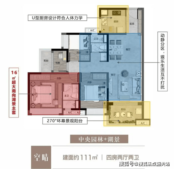 111㎡四房两厅两卫:南向三开间望湖,空间宽敞,是二胎家庭的理想选择;