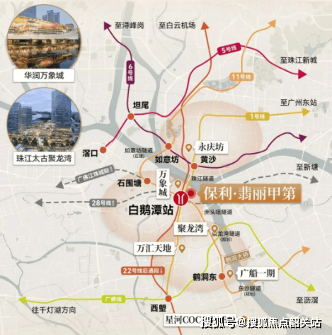 首先,轨道交通方面,项目享有得天独厚的优势。步行仅171米,即可到达地铁1号线芳村站。值得注意的是,该站点在未来规划中已明确更名为“白鹅潭站”,这不仅是一个名称的变更,更代表着该站点作为区域核心枢纽的地位将得到进一步提升。更为重要的是,这里将是未来广州轨道交通网络中的超级枢纽——1号线、11号线、22号线、28号线四条地铁线路的交汇点。