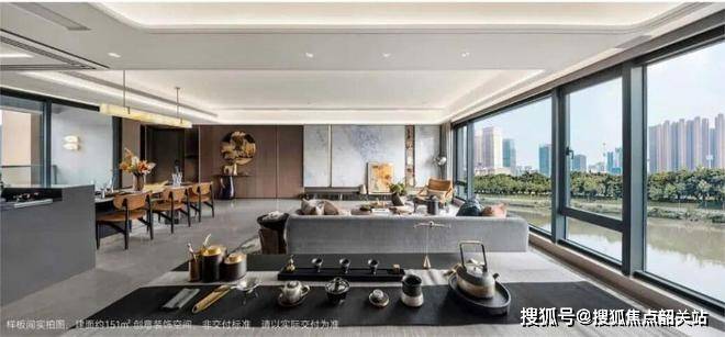 建筑设计上,项目玩了一个小巧思——楼体整体朝江旋转15度。这个调整让每一户都能最大限度享受到东南向的江景视野,基本实现270°无死角观景。立面用钻感鎏金天幕搭配顶部金色徽标,看起来很有辨识度,大面积玻璃幕墙让室内采光特别好,江景也更通透。整栋楼的高度约130米,成为周边天际线里的一道亮点。住在这里,早晨被江风叫醒,晚上能看到对岸灯火和千灯湖的夜景,居住体验确实超出一般高层。