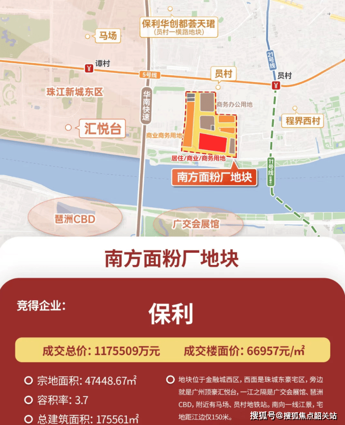 位于天河区临江大道北侧的AT080722地块,即南方面粉厂地块,于2024年9月29日由保利地产以1175509万元总价竞得,折合楼面价66957元/㎡。扣除配建后,实际可售楼面价高达76502元/㎡,成为广州楼面价TOP2项目。该地块地理位置优越,毗邻珠江新城和金融城起步区,是广州市核心地段的重要组成部分。