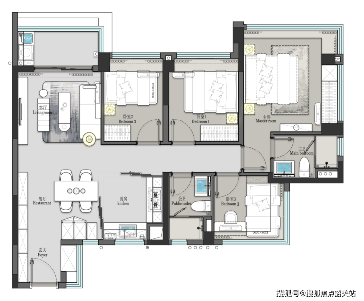 78㎡三房两卫:四开间三房,使用率超105%,LDK互动布局,主卧大套房设计。