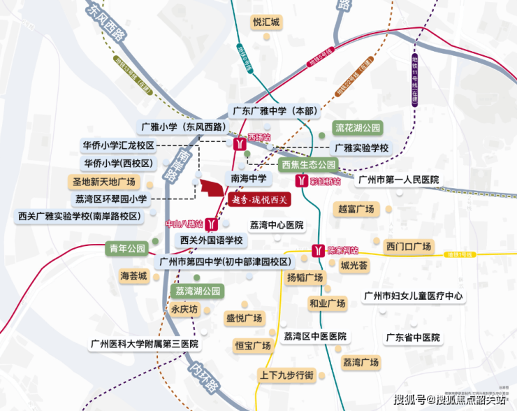 地铁:项目位处老西关板块核芯,临近地铁5/11号线(在建中)中山八站,未来2站陈家祠/纪念堂,3站公园前,零换乘直达珠江新城、琶洲、金融城三大CBD;