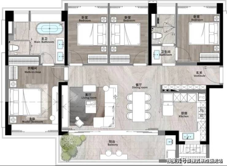 空间设计:独创“洄游动线+双主卧套房”设计,LDKB一体化厅堂(客餐厨阳台)面积占比超65%