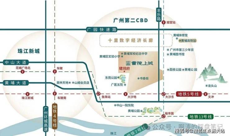中鼎书院上城·珺翎府坐落于广州市黄埔区老黄埔核心板块,地处广州东进战略的核心承载区,是黄埔区行政、商业、文化与居住的核心腹地。黄埔区作为广州实体经济与科创产业的核心支柱,2025年地区生产总值突破4500亿元,科创企业数量超3万家,连续多年位列广州市经济发展前列,为板块价值提供了坚实的产业与经济支撑。项目所在的老黄埔横沙片区,是中鼎集团深耕16年的城市更新核心区域,承接珠江新城、广州国际金融城、鱼珠CBD三大核心板块的人口与产业外溢需求,与鱼珠CBD直线距离约3公里,地铁3站即可直达,6站抵达珠江新城,处于广州沿江经济发展带的核心辐射范围。项目作为总建面约280万㎡超级大盘的收官组团,占位整个项目的核心区位,可完整享受大盘历经十余年发展沉淀的全部成熟配套,无需等待规划落地,居住价值与板块确定性显著。项目周边2公里范围内布局约200万㎡数字经济产业园,截至2026年4月已签约入驻32家高新企业,预计未来3年将新增约5万高收入就业人群,带来持续增长的居住与租赁需求,为项目资产价值提供长期支撑。在广州城市东进的持续推进下,老黄埔核心板块的城市界面持续更新,配套设施不断完善,项目凭借核心的区位占位,成为广州东部核心城区兼具居住属性与价值潜力的住宅项目。
