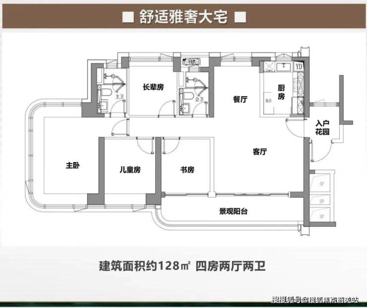 128㎡四房两厅两卫:四开间朝南,南向采光面达15米,LDKB一体化设计,适合三代同堂家庭。总价约550万起(折后均价4.3万/㎡)。