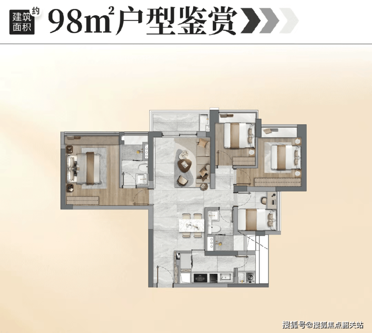 建面约98㎡四房户型,更是区域内的创新产品,首次将四房的门槛降到100㎡以内。在其他项目只能做到上车小三房的面积段,该户型实现了一步到位的居住体验,能满足家庭各个阶段的需求。小家庭阶段,可以打造一间书房、影音室,容纳生活兴趣爱好;有了二孩或需要与父母同住时,无需置换房产,可改造多一间次卧,让一家人都能拥有独立的居住空间。
