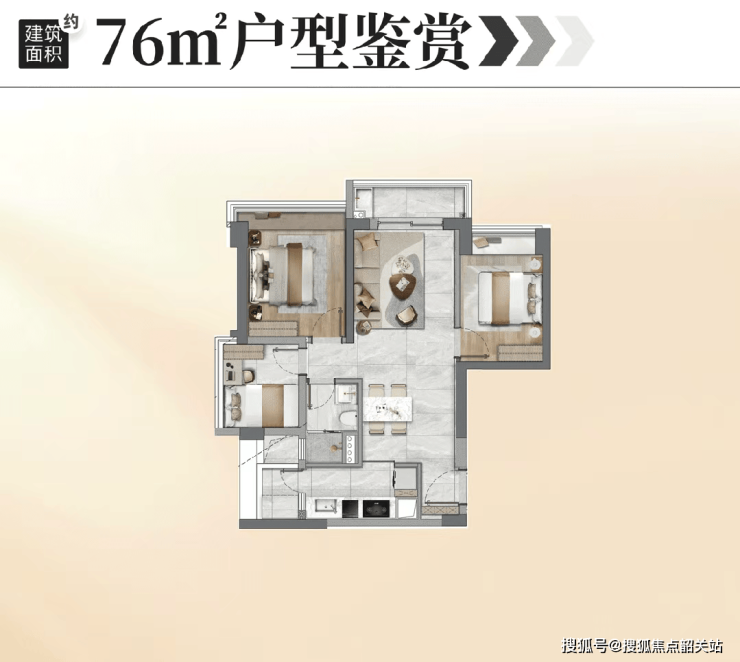建面约76㎡户型,在同面积段项目中极具竞争力。该户型不仅做到了真正实用、舒适的三房设计,打破了传统76㎡只能做两房或逼仄“1+2”房的局限,还实现了江园双景的景观升级。每个家庭成员都能拥有独立、舒适的居住空间,次卧也足以放下双人床和衣柜,满足刚需家庭的居住需求。