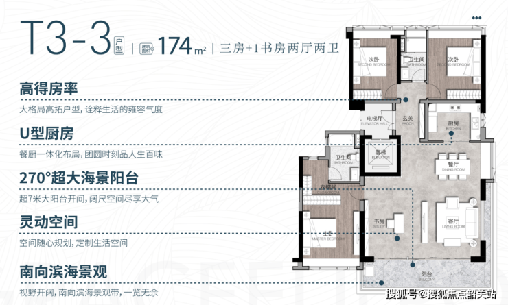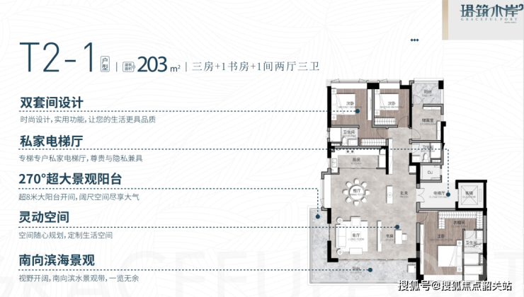 建面约203㎡三房+1书房+1间两厅三卫(平层):该户型定位顶级改善,空间尺度恢弘,布局奢华大气,全方位满足高端家庭的居住需求。整体户型南北通透,全明设计,采光通风极佳,客厅采用大面宽、短进深设计,搭配全景落地窗,彰显高端住宅的大气格调。书房空间独立宽敞,可作为私人办公区或藏品室,彰显业主的品味与身份;额外一室可作为客房、儿童房或健身室,满足家庭多元化需求。主卧套房奢华宽敞,配备独立卫浴、步入式衣帽间与超大观景飘窗,空间充足,可摆放休闲沙发、梳妆台等,提升居住舒适度;两个次卧均为套房设计,配备独立卫浴,保障家人私密性;三卫设计,干湿分离,满足多人口家庭的日常使用需求,整体户型奢华舒适,适合追求极致居住体验的高端家庭。