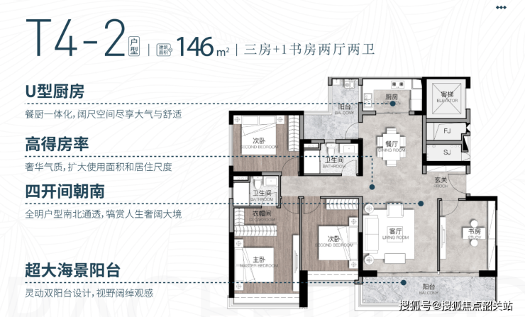 建面约146㎡三房+1书房两厅两卫(平层):该户型主打舒适改善,空间开阔通透,布局科学合理,注重居住舒适度与实用性。客厅连接超大景观阳台,视野开阔,可将社区园林与周边生态景观尽收眼底,日常休闲、晾晒均可满足。书房空间独立静谧,适合阅读、办公,也可改造为次卧,提升空间利用率。主卧套房设计,配备独立卫浴与步入式衣帽间,空间宽敞,采光通风俱佳,为业主提供私密舒适的休憩空间;两个次卧空间宽敞明亮,配备观景飘窗,居住舒适度高。厨房采用U型设计,操作动线合理,预留充足储物空间,满足日常烹饪需求,整体户型适合追求高品质生活的改善家庭。