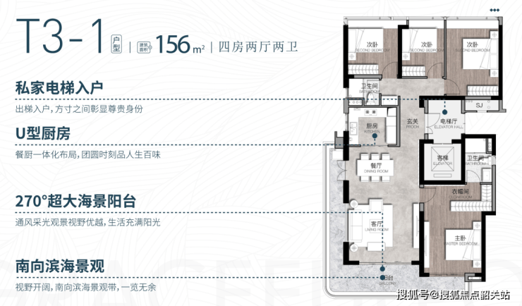 建面约156㎡四房两厅两卫(平层):该户型为项目明星产品,定位高端改善,户型极致方正,无空间浪费,南北通透设计,四开间朝南,采光面极致开阔,全屋阳光充沛。LDK一体化设计让客厅、餐厅、厨房形成互动空间,既提升空间利用率,又增强家庭互动氛围。约16米超长270°L型阔景阳台,贯穿客厅与次卧,直面中央园林与万亩生态景观,IMAX级景观视野将四季美景尽收眼底,采光通风效果俱佳。户型采用动静分区布局,卧室集中布局、私密性强,主卧为独立套房设计,配备专属卫浴、步入式衣帽间与观景飘窗,保障主人居住舒适度与尊崇感。四房格局满足二孩家庭或三代同堂居住需求,功能分区清晰,动线流畅,适合人口较多的高端改善家庭。