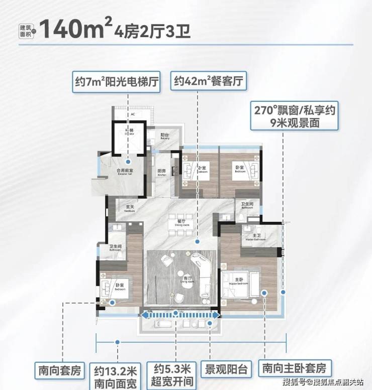 项目主推92-142㎡三至五房,92㎡的2+1房实际使用面积接近其他楼盘100㎡的空间,做到三开间朝南,主卧带飘窗,客厅连通阳台,采光通风效果佳;142㎡的五房采用横厅设计,主卧配备270°飘窗,前后可俯瞰园林景观,适合多人口家庭。所有户型均为全南向布局,确保了充足的采光,2梯3户或2梯5户的梯户比减少了等电梯时间,居住密度低,进一步提升了舒居感。