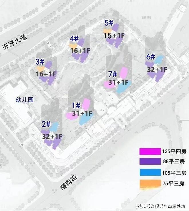 户型设计亮点十足。整个项目 7 栋商品住宅,前排 4 栋 32 - 33 层,后排 3 栋 16 - 17 层,3 - 4 - 5 - 6 栋为 2 梯 5 户,1 - 7 两栋为楼王,2 梯 4 户。前后两排布局优势明显,散点式排布提高单边位采光和视距,增加单边位货量;前后平行排布形成通透式中心园林,拉大楼栋间距。