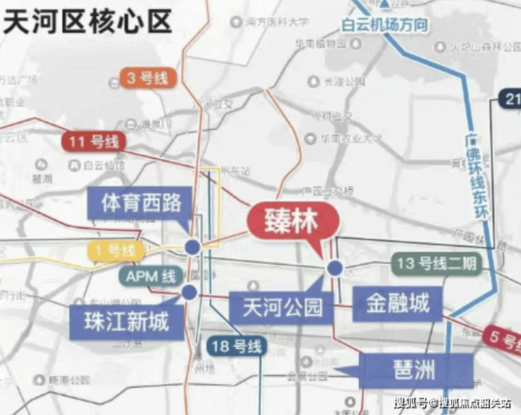 天麟府·瑧林位于天河公园板块西侧,与珠江新城、金融城、琶洲三大CBD形成“黄金三角”辐射圈,直线距离均在3公里内。项目旁即有黄埔大道、中山路、天府路等多条主干道,距天河公园地铁站仅500米,该站为亚洲最大在建地铁枢纽,汇聚21号线、11号线(在建)、13号线二期(在建)三条地铁线,20分钟内可达三大CBD核心区。据官方数据,天河公园站日均客流量超10万人次,是广州轨道交通网络的关键节点。