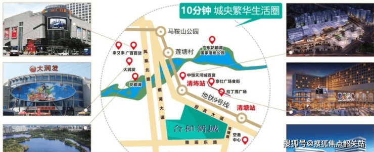 合和新城坐落于花都区空铁融合发展示范区核心,依托广州白云国际机场与广州北站双枢纽优势,区域定位为“粤港澳大湾区北部综合交通枢纽”。根据《广州市花都区国土空间总体规划(2021-2035)》,项目周边3公里内规划建设超200万㎡商业综合体、三甲医院及国际学校,未来将形成集商务、居住、文旅于一体的现代化新城。目前,地铁9号线清塘站已开通,18号线北延段(预计2026年通车)与24号线(规划中)交汇于项目周边,构建“15分钟主城生活圈”,区域价值持续攀升。
