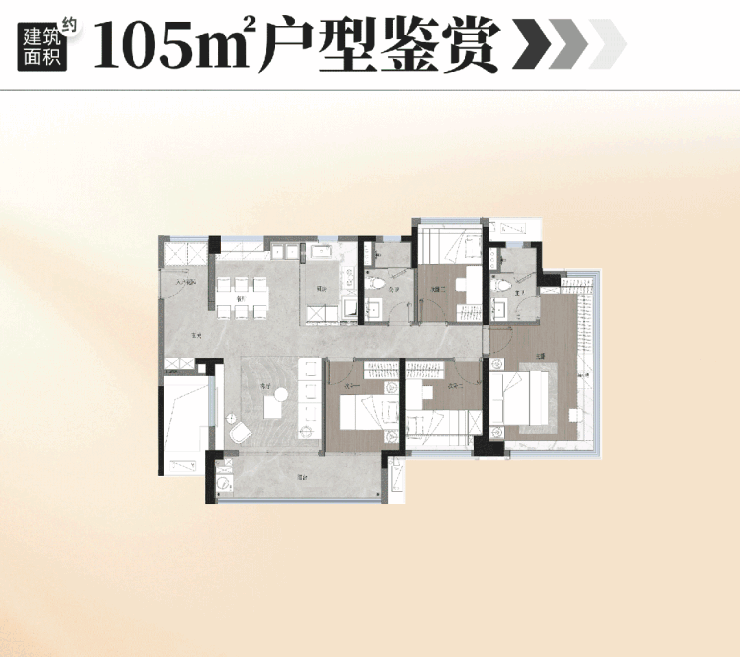 建面约105平方米的3+1户型,则进一步提升了居住的品质感。该户型实现了南北通透,四开间朝南,确保了充足的采光与通风。客厅最大开间可达约6米,配合长阳台设计,带来了类似“全面屏”的景观体验。主套房设计包含了超大衣帽间、全明梳妆区及三分离洗手间,功能配置对标酒店行政套房。此外,项目在细节处理上也颇具匠心,如利用S墙隐藏冰箱,保持厨房立面的整洁;设置中岛台延伸操作空间;在卫生间预设收纳薄柜等。这些设计将传统户型中容易被浪费的角落转化为实用的储物空间,相当于为家庭额外“挤出”了一间储物仓,极大地提升了空间的实际使用率。