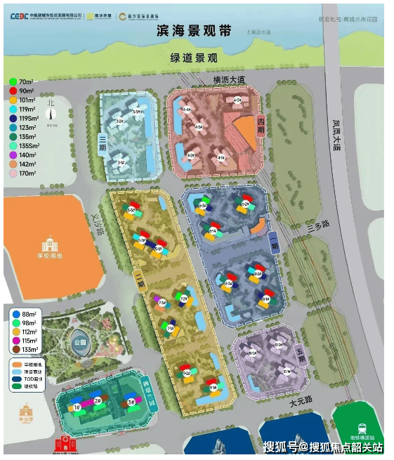 项目规划有10个地块,分五期开发,共规划25栋住宅楼,总高在30-37层之间,其中7-2栋为30层高,9-1/2栋为37层高,避难层设置在13F、25F,这样的设计既能保障居住安全,又能减少避难层对周边住户的影响。总总户数约5000户,属于大型社区,大型社区的优势很明显——能配建更完善的内部配套,也能更好地保障居住圈层的纯粹性,不会显得杂乱。