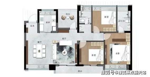 接下来是115㎡的3+1室2厅2卫户型,同样是南向朝向,这个户型主打宽阔空间,适合改善型家庭。3+1户型设计,超高的空间扩容性和多变性,能满足家庭的多元化需求,超30㎡的宽广餐客通厅,空间开阔,尽显尊贵,平时接待亲友、家庭聚会,都能轻松应对,不会显得拥挤。作为园林景观大平层阔绰四房,餐厅和卧室全飘窗设计,南北采光通透,室内光线充足,空气流通性好,居住起来非常舒适。