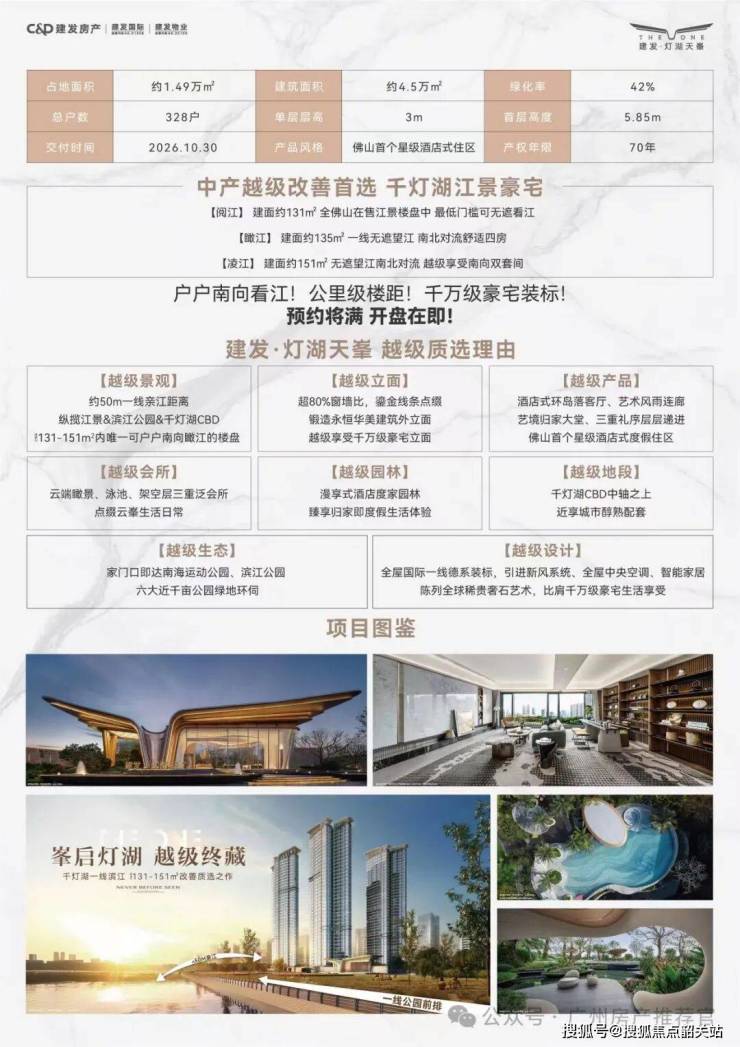 2023年,建发房产凭借强劲的综合实力,荣获“中国房地产开发企业50强”第11位,同年1-8月全国销售榜单位列第8位(数据来源:克尔瑞),充分彰显了企业在房地产行业的核心竞争力与市场认可度。建发房产深耕广佛市场多年,深刻洞察高端人群居住需求,精准布局城市核心板块,打造的中轴滨江双子星作品,凝萃40余载高端产品造诣大成,其中建发·灯湖天峯定址千灯湖中轴滨江黄金S湾之上,以131-240㎡天幕云邸产品,缔造佛山滨水豪宅封面,延续建发高端产品基因,从规划设计、建筑施工到装修交付,均严格按照高端豪宅标准执行,致力于为广佛层峯人群打造高品质、高格调的居住体验,彰显品牌实力与匠筑初心。