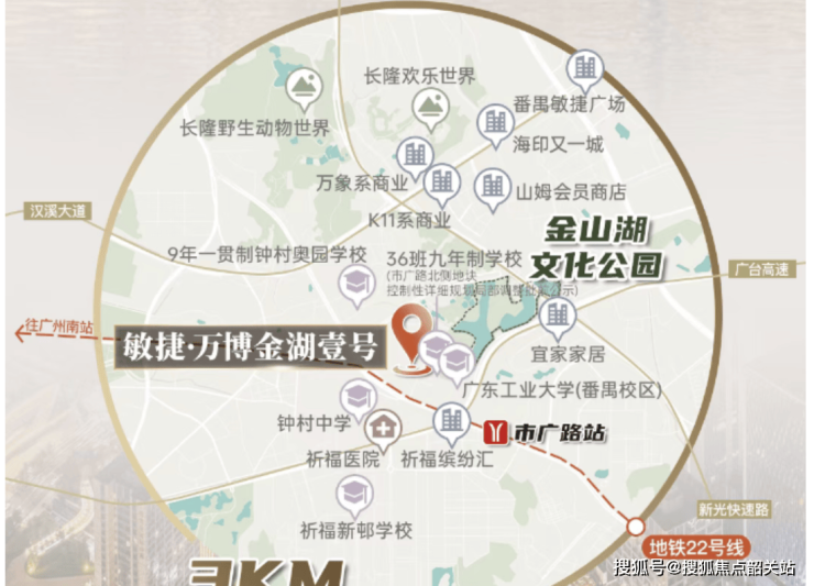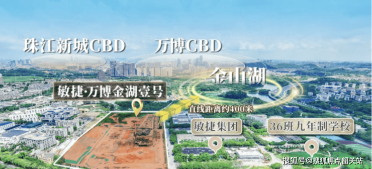 项目虽名为“万博”,实则位于祈福板块核心,紧邻约1630亩金山湖公园,直线距离仅约400米。这种“出则万博繁华,入则金山湖静谧”的双重占位,加上1630亩的不可再生湖景资源,是广州主城区绝无仅有的孤品,资产价值极具防御性。
