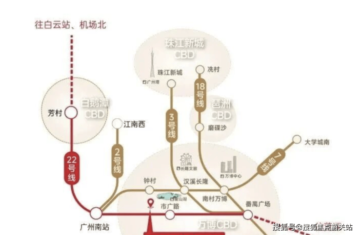 项目距离地铁22号线市广路站约800-900米,步行即可到达。22号线作为大湾区首条时速160公里的“地表最快地铁”,2站到万博核心,3站通琶洲、4站达珠城,通勤效率极高。这意味着,您可以住在拥有湖光潋滟的社区,却在半小时内到达珠江新城上班。