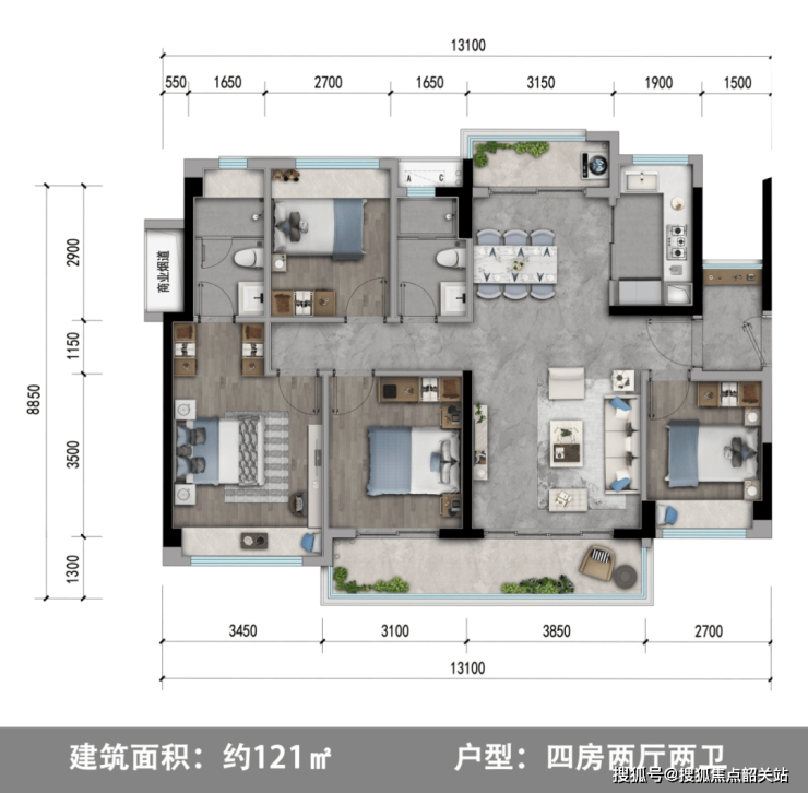 二孩家庭:169㎡四房(南北双阳台,主卧270°转角飘窗),总价约300万,月供约1.1万;
