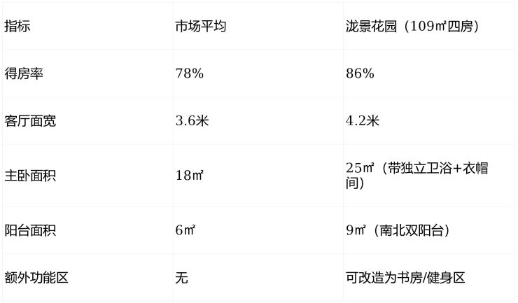 我们以100㎡户型为例,对比市场平均水平与泷景花园的设计差异: