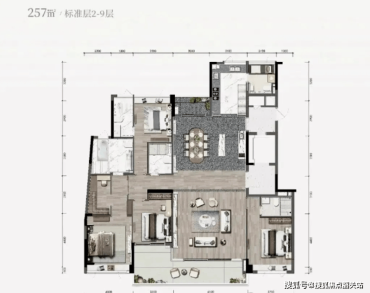 建面 257㎡四房三卫: 景观优势突出,直面山体公园,单价 6.5-6.8 万/㎡,中间楼层房源较多。