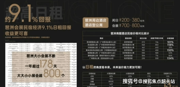 除了长租市场,琶洲独特的“展会经济”更为项目带来了可观的日租收益。作为广交会的举办地,琶洲全年展会不断。2023年,琶洲全年举办展会800场,累计展期达178天。在展会期间,周边酒店一房难求,价格飙升。区域内的商办产品转型为酒店型日租房或民宿,闲日租价可达200-380元/天,而在会展期间,租价更是飙升至700-800元/天。据测算,以会展租价计算,区域内优质的商办产品一年最高收益可达13万元,民宿经济的日租回报率约为9.1%。这种“平时收长租,展会收高租”的双重收益模式,让越秀·琶洲ONE57成为了名副其实的“现金奶牛”。
