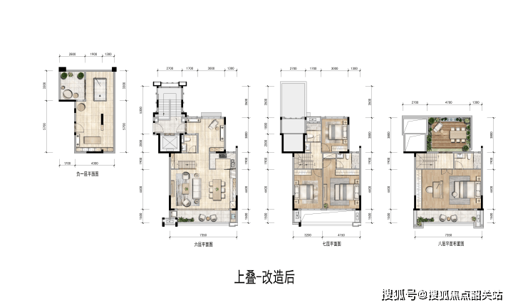 六层餐客厅厨房,七层是休息区共有3间卧室,八层整一层南北通透的大主卧,北有露台南有阳台。