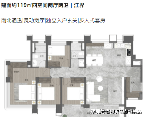 135㎡四房两卫:270° 全景主卧套房 + 一体化瞰江宽厅,三开间朝南,二孩家庭首选;