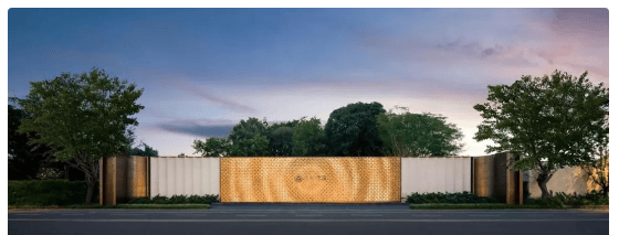 作为项目的点睛之笔,星曜会所以“非遗为魂,鎏金为骨”为定位,将岭南文化与现代美学完美融合。入口处2400片电镀金鳞片组成的金鳞墙,日光下光影流转,夜晚与珠江波光交相辉映;56米长、10米高的“一城风华门”,搭配克罗地亚弧形贝金米黄大理石与罗汉松阵列,尽显门庭气派;门楣处的“江山华盖顶”采用钉金绣技法,将金线银线交织成天曜八芒星logo,低调中透着奢华。