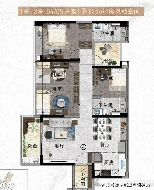 125㎡四室两厅两卫户型:多开间朝南,享受充足光照;入户花园实现归家礼仪与净污分离;创意阳台提供专属领地;全能主卧配备独立衣帽间和大飘窗。