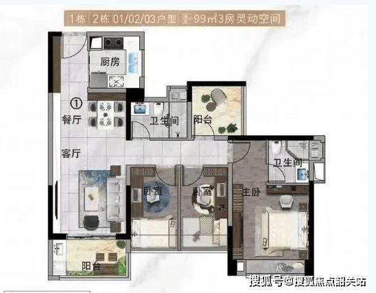 99㎡三室两厅两卫户型:户户朝南,通透空间设计,尽享阳光沐浴;经典竖厅格局,动静分区合理;双阳台设计提升生活品质;个性化灵动空间适合二孩家庭。