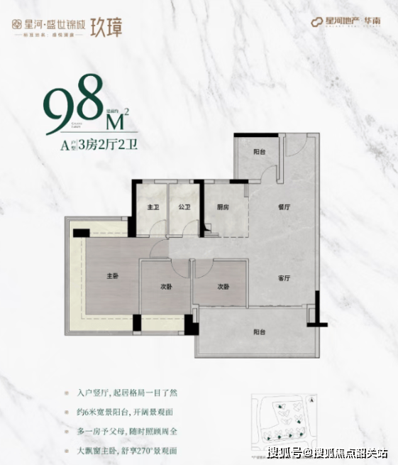 98㎡三房:主卧配备270°无柱飘窗,视野无遮挡;次卧与阳台尺度升级,实用率高达98%以上;