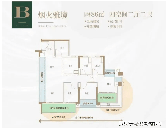 四/五开间朝南设计:主卧套房标配270°环幕飘窗,提升居住舒适度。