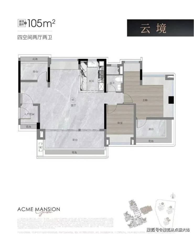 建面105平纯四房两卫,4.5米开间朝南,南北对流,双面宽阳台,主卧配独立衣帽间,