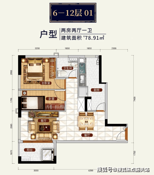 约 71 - 79㎡的两房和约 88 - 104㎡的三房。