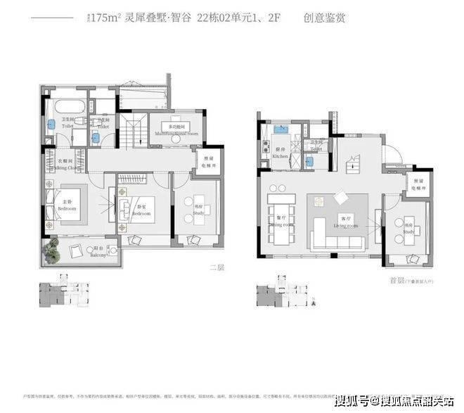 智谷(建面约 175㎡下叠):同样私梯入户,入户玄关设计增加归家仪式感。中西厨一体化,全明大横厅,动静分区合理。南北私家领地,主卧套间私享景观阳台,功能房全南向并共享休闲阳台,为亲子时光提供了更多美好的空间。