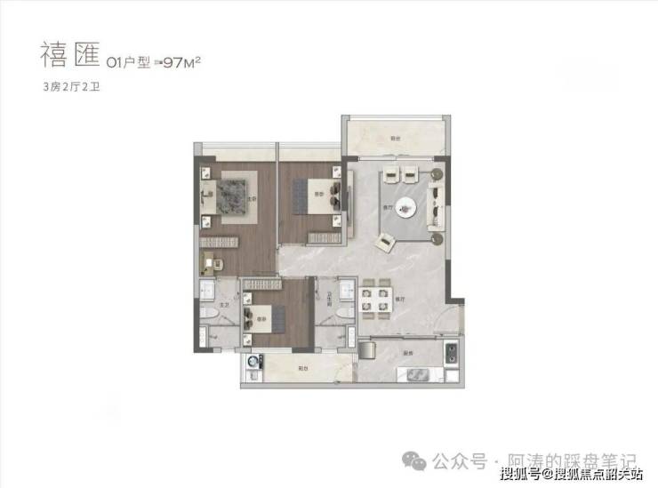 97㎡户型,是三口之家的优选户型。户型格局方正,南北通透,采光通风极佳,客厅与餐厅相连,空间开阔,能够满足家庭聚会、休闲娱乐等多种需求;三个卧室空间充足,主卧配备独立卫生间,保障了主人的私密性与舒适度,次卧与书房(可改造为儿童房)布局合理,能够满足家人的不同需求;阳台宽敞,视野开阔,闲暇之余,可在这里赏景、品茶、晾晒,享受惬意的生活时光。这个户型空间充足,布局合理,兼顾了实用性与舒适性,是家庭居住的理想选择。