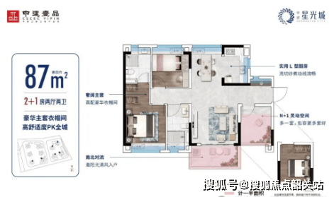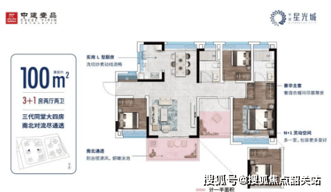 中建·星光城提供多种户型选择,包括约69-100平方米的三房至四房单位,所有户型均为南向布局,空间利用率高达94%,保证了良好的采光和通风效果。特别是建面约91平方米的南北通透四房户型,宽敞明亮,适合大家庭居住。